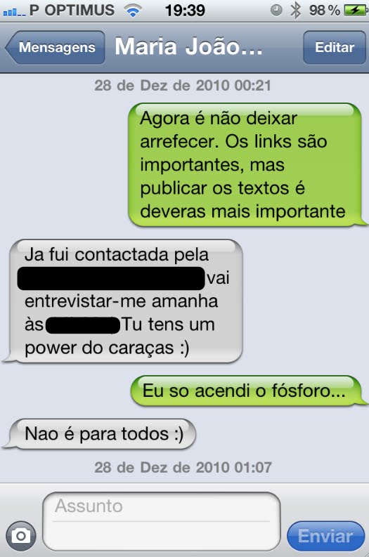 São três da tarde do último dia do ano. Acabei de regressar de um almoço de amigos e tenho de voltar ao trabalho acumulado. Não vou de boa vontade. Porque vou ter de ir trabalhar e não me apetece rigorosamente nada fazê-lo, e porque tenho algumas preocupações particulares que me têm trazido de algum modo mais nervoso do que o habitual. Quando pego no telefone e informo a minha rede em tom de brincadeira: "Tenho de ir trabalhar, mas informo desde já que vou contrariado", estou longe de imaginar que esta vai ser uma tarde que terminará de forma diferente. Resolvido o meu primeiro problema de agenda, dou uma olhadela ao Twitter e percebo que há tweets de vitória, relacionados com o caso Ensitel. Precipito-me para links e fontes e é de forma atabalhoada que cruzo na diagonal os primeiros indícios, até aterrar no comunicado da empresa que leio com sofreguidão. Tenho aliás de o reler várias vezes, pois não quero me escape um detalhe que seja, não pode ser falso, a vista não me pode trair, não pode ser uma mentira cruel. Não pode. Ponto.