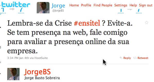 O denominado "Caso Ensitel" foi o percussor de um dos mais divertidos fenómenos meteorológicos de que tenho memória na minha vida profissional. Conjuntamente com as chuvas de inverno, sucederam chuvas intensas de peritos "Social Media". De repente, desde o filho da Dona Rosinha que é muito jeitoso com computadores e que tem umas amigas no Facebook, até a Agências de Comunicação de que ainda se não tinha ouvido falar, mas que sabem tudinho sobre como resolver bicos de obra sociais e que levaram em média quatro dias a exclamar "O Rei vai semi-despido!", quando toda a gente, desde o primeiro instante, sabia que El Rei ia mesmo nu, saltaram para as suas páginas anunciando a salvação do Reino. A imagem abaixo é apenas um mero exemplo. Um consultor de "presenças web" que escolhe como usernameno Twitter "JorgeBS", está mesmo, mesmo a pedi-las....