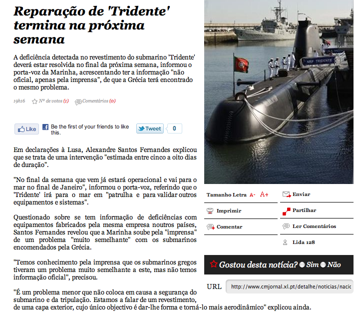 Atente o leitor na última frase deste (a todos os títulos espantoso) artigo. O porta-voz da Marinha Portuguesa desconhece que os submarinos não voam. Também me ocorre pensar que o jornalista ao redigir o texto, poderia ter resolvido a questão, mas isso porventura já seria pedir demais.