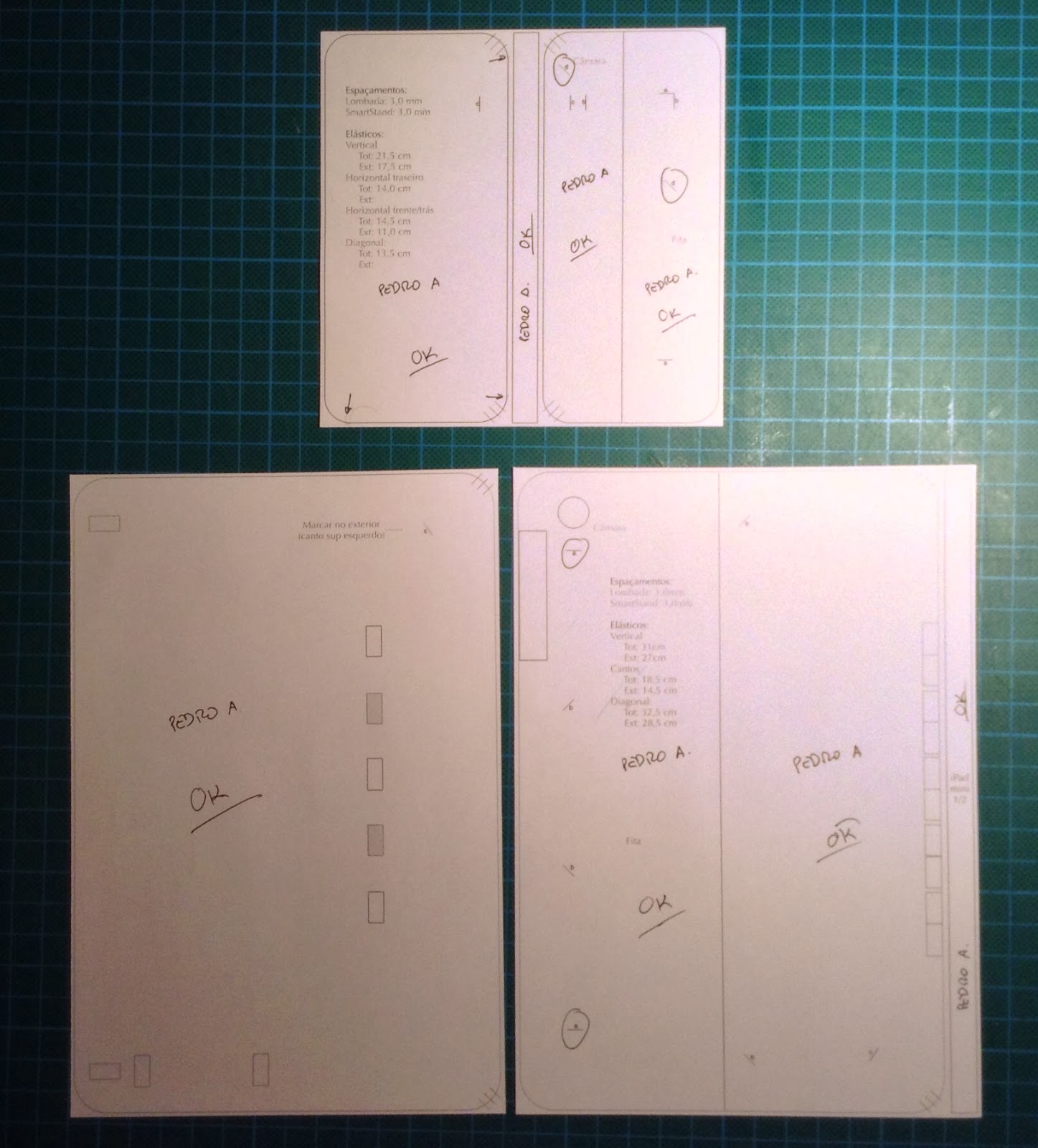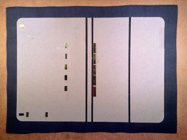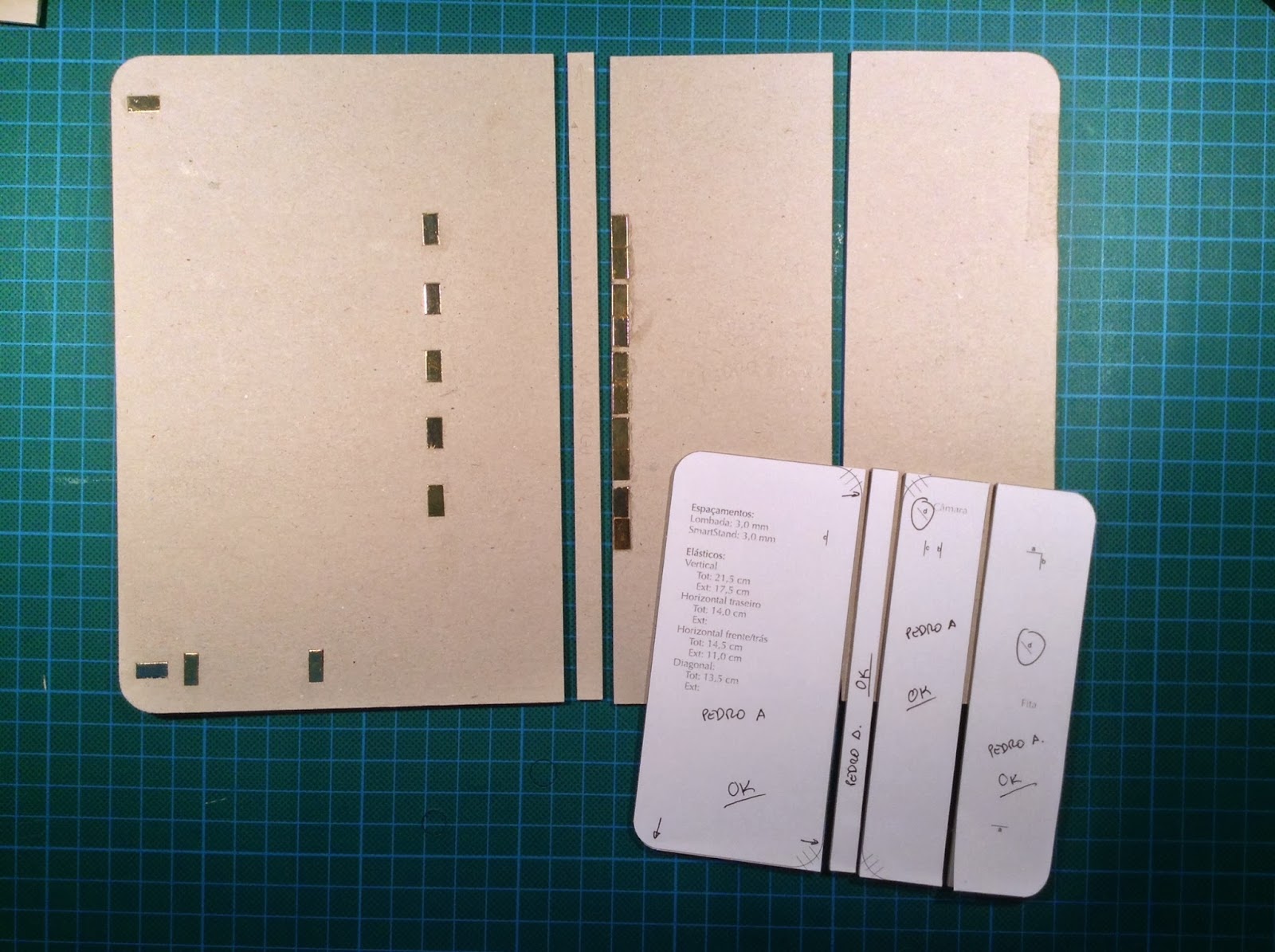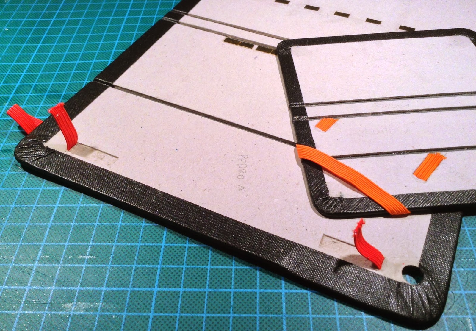 Saídas da prensa onde estiveram 24 horas em processo de colagem, eis aquilo que começa a ganhar forma, as minhas capas de iPhone e iPad. tecidos cortados já com a margem da dobra, magnetos embutidos nas respectivas posições. As próximas imagens já revelarão as fixações dos elásticos de fecho e será observável o trabalho de dobragem do excesso de tecido exterior.