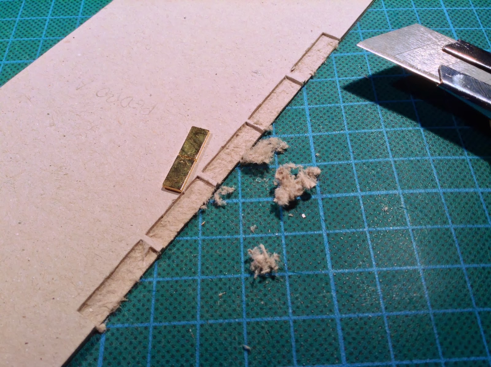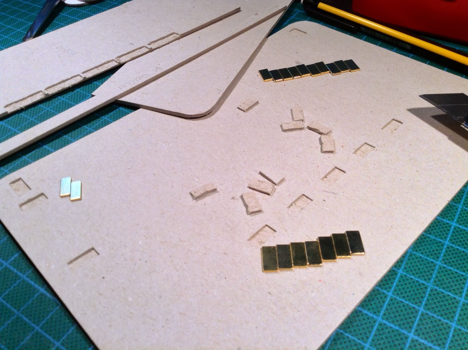 Seccionadas as componentes do miolo da capa (cartão prensado de excelente gramagem), os cantos dos componentes são arredondados. Os locais dos magnetos são cortados e vazados com a profundidade correcta para ficarem embebidos sem existerem protuberâncias indesejadas, procedendo-se ao embutir dos mesmos respeitando as polaridades que hão-de interagir com o iPad, seja no fecho correcto da capa, seja na função wake/sleep.