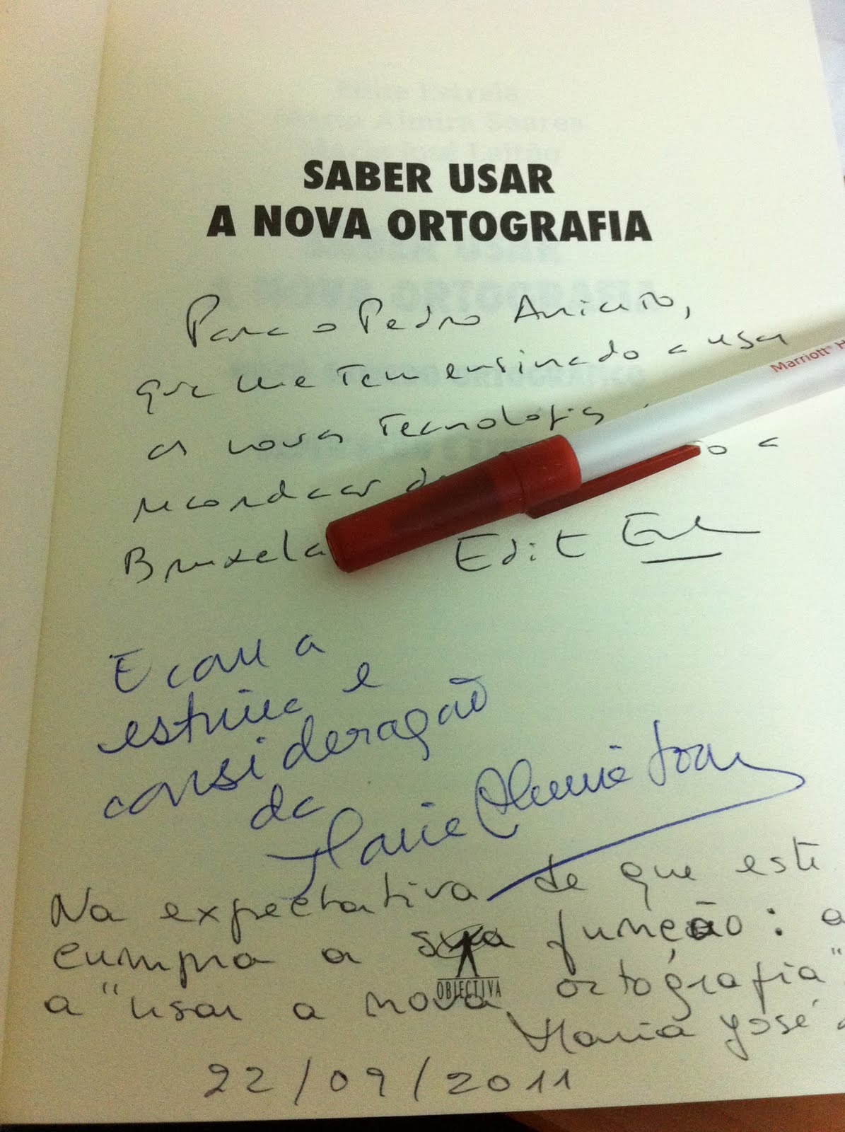 Na passada sexta-feira e durante a minha visita a Bruxelas, tive o prazer de estar presente na Livraria Orfeu para o lançamento do livro "Saber usar a nova ortografia", da autoria de Edite Estrela, Maria Almira Soares e Maria José Leitão (Objectiva Editores). Tratava-se de uma excelente oportunidade para ouvir não apenas as autoras, mas também os apresentadores do livro, que divididos por duas facções (pró e contra o acordo) haveriam de explicar à atenta plateia os seus argumentos.